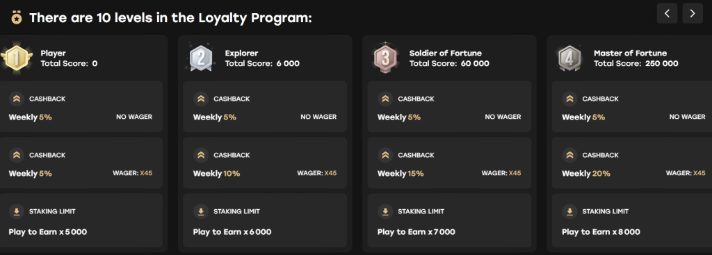 - VIP Club Platinum: Pelaamisen ehdoton huippu. Platinum-jäsenet nauttivat 10 % päivittäisestä kierrätysvapaasta cashbackista ja peräti 500-kertaisesta kertoimesta staking-potentiaalilleen. Tämä taso on tarkoitettu niille, jotka vaativat kasinoltaan vain parasta ja täydellistä läpinäkyvyyttä.